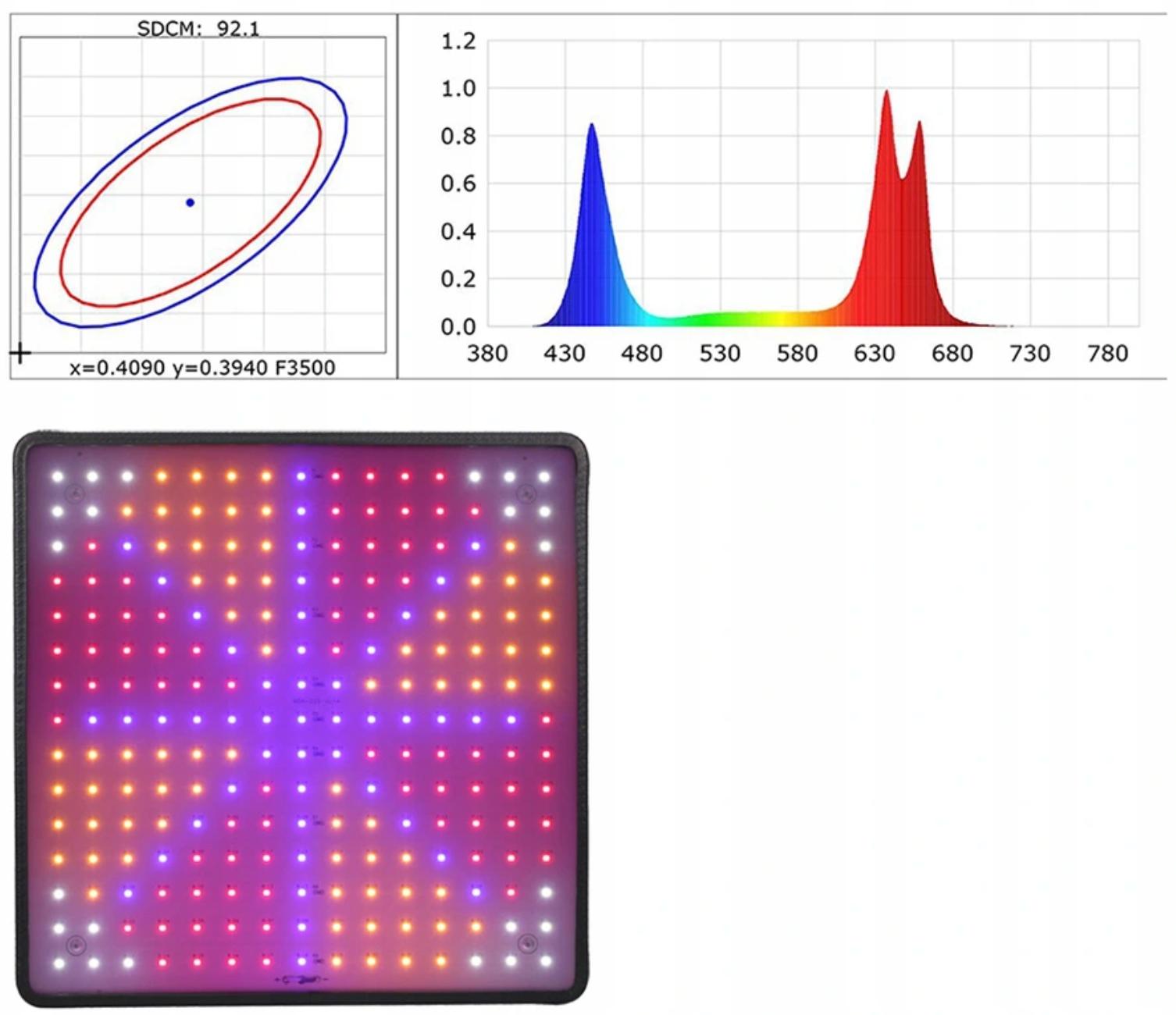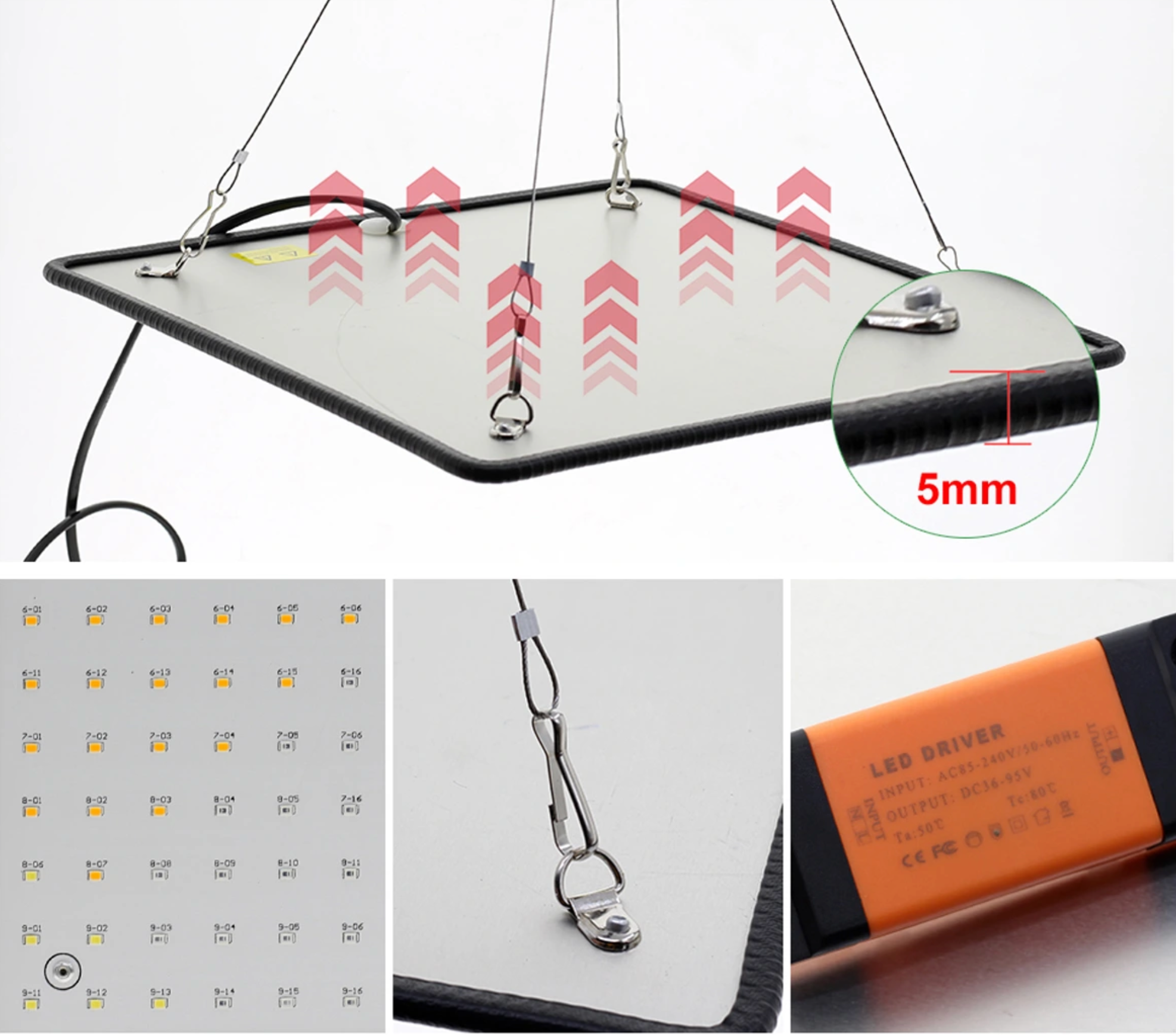• eingebaute 225 LEDs mit einem Durchmesser von 5 mm • Vollspektrumlicht • lange Lebensdauer • geeignet für eine Vielzahl von Pflanzen • einfache Installation und die Möglichkeit zum Aufhängen • leichte und solide Konstruktion • erhöht die Umgebungstemperatur nicht • Energiespardioden • langes Netzkabel |