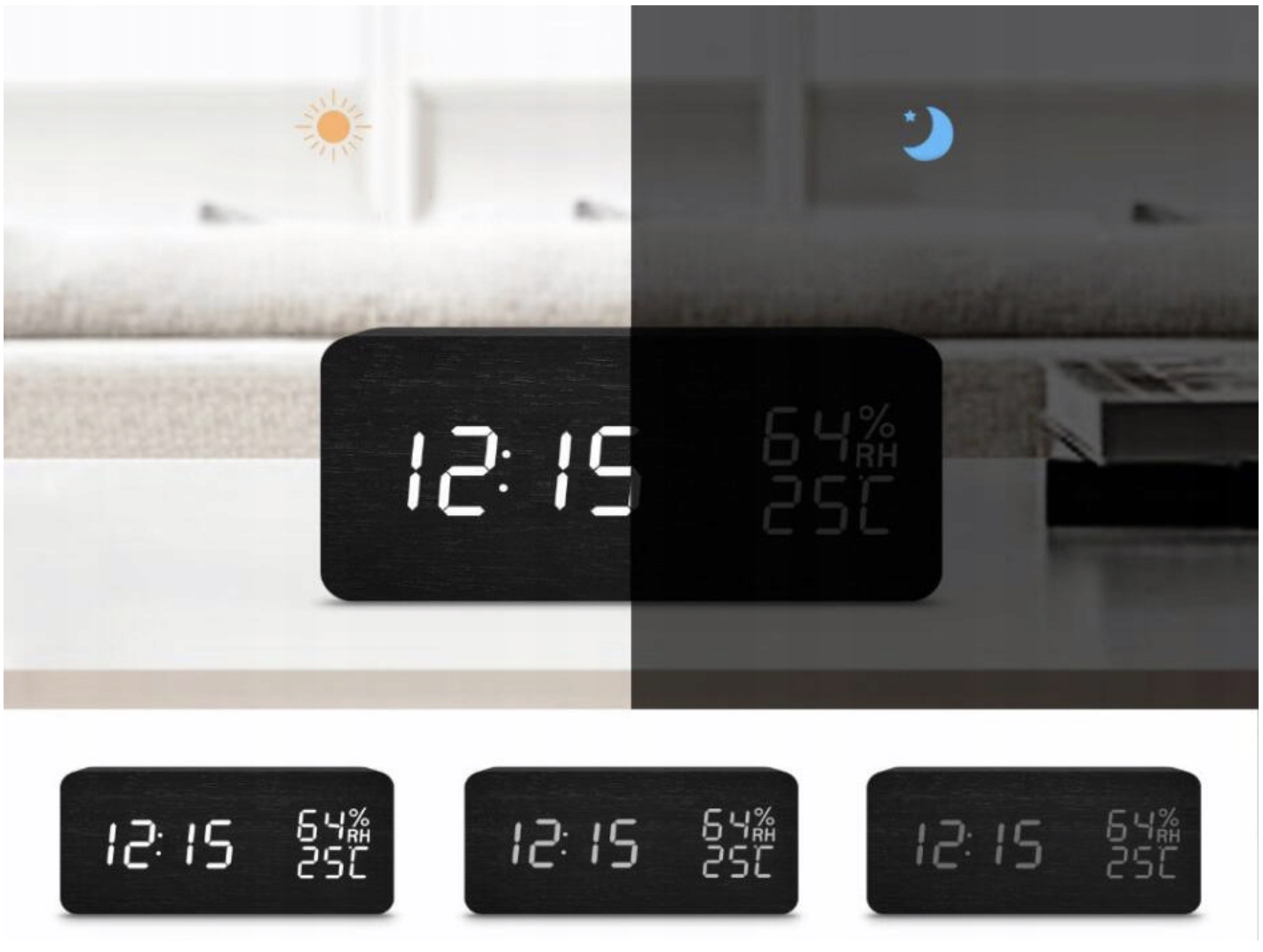 The brightness can be adjusted So that the clock with the alarm clock does not disturb you at any time, you can choose one of the bright brightness levels: light, medium and dark. How to adjust brightness: Press the "UP" button on the back of the device for 3 seconds and then press "UP" or "DOWN" to adjust the brightness. |