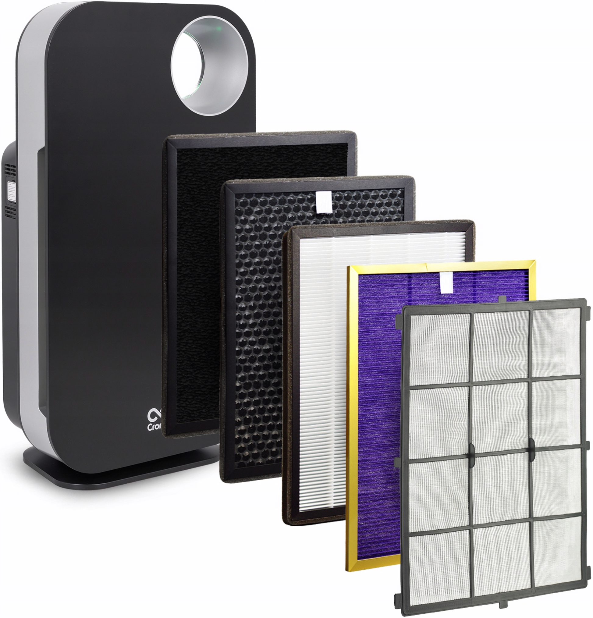 • Purificador de aire Cronos Ring negro • Juego de filtros de aire (se pueden comprar filtros de repuesto) • Instrucciones en alemán • Factura |