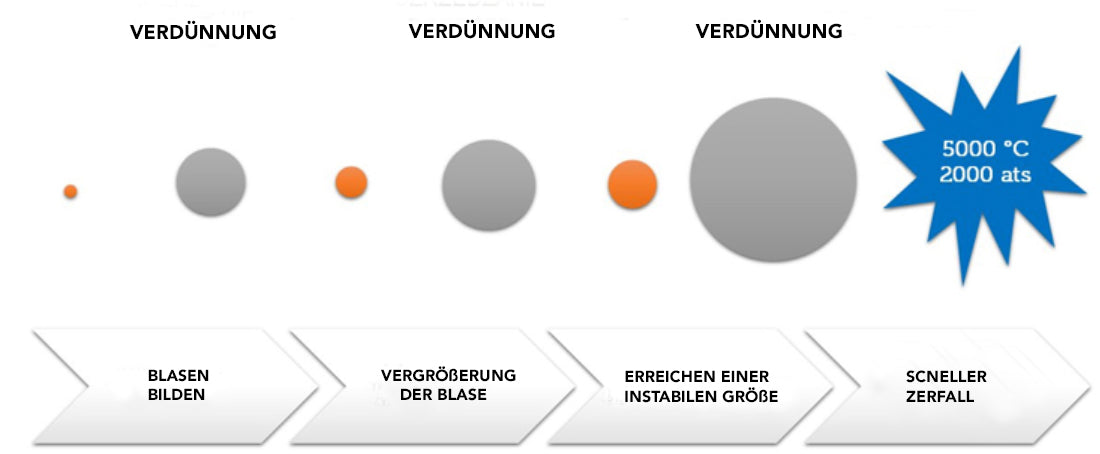 El funcionamiento de un limpiador ultrasónico se basa en el fenómeno físico de la cavitación. Durante la limpieza, se generan ondas de presión de alta frecuencia y, como resultado, millones de pequeñas burbujas implosionan en la superficie del artículo que se está limpiando.