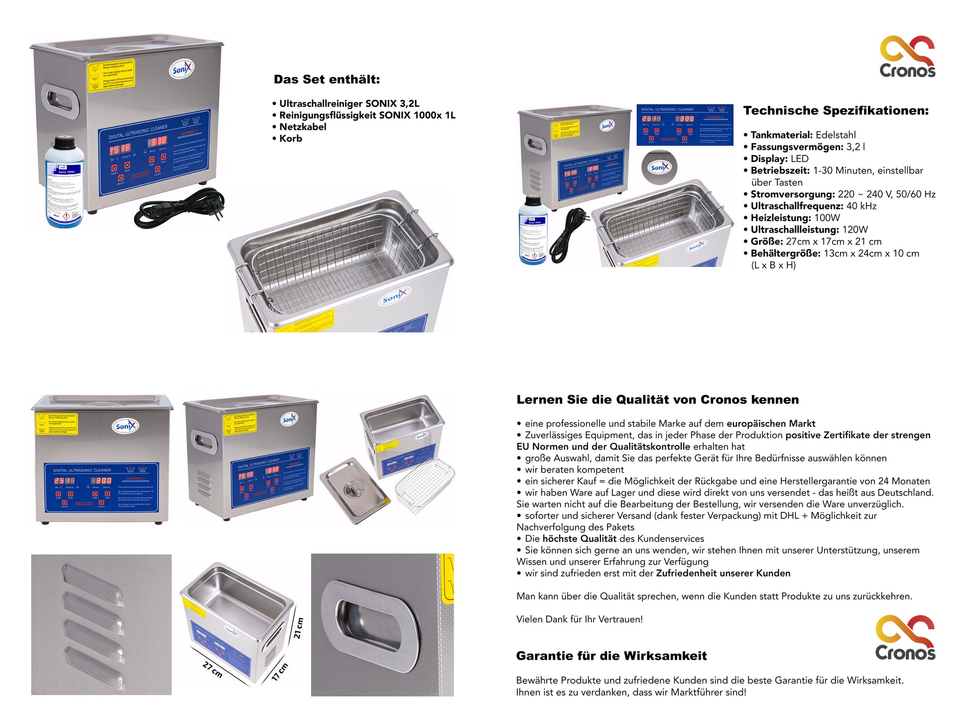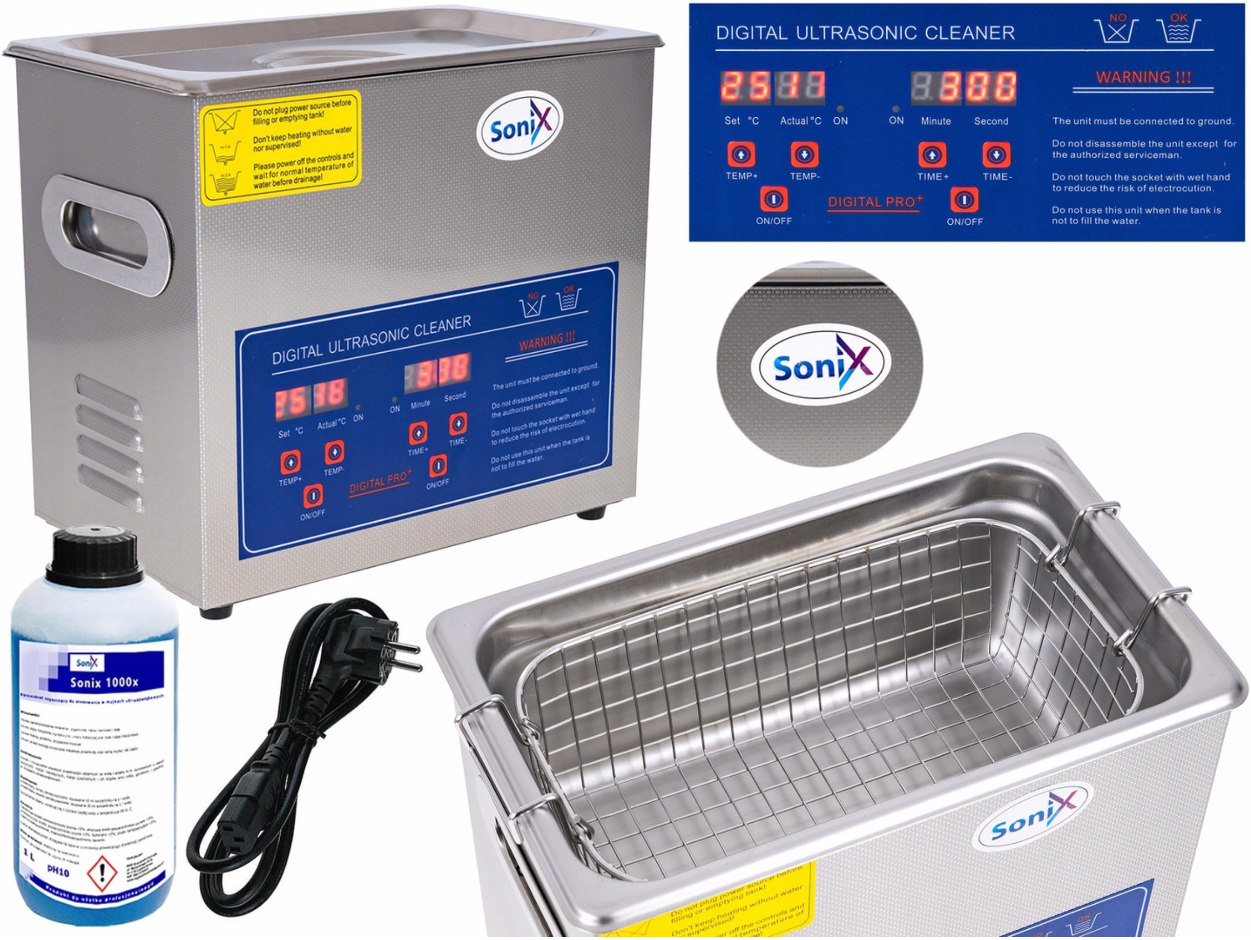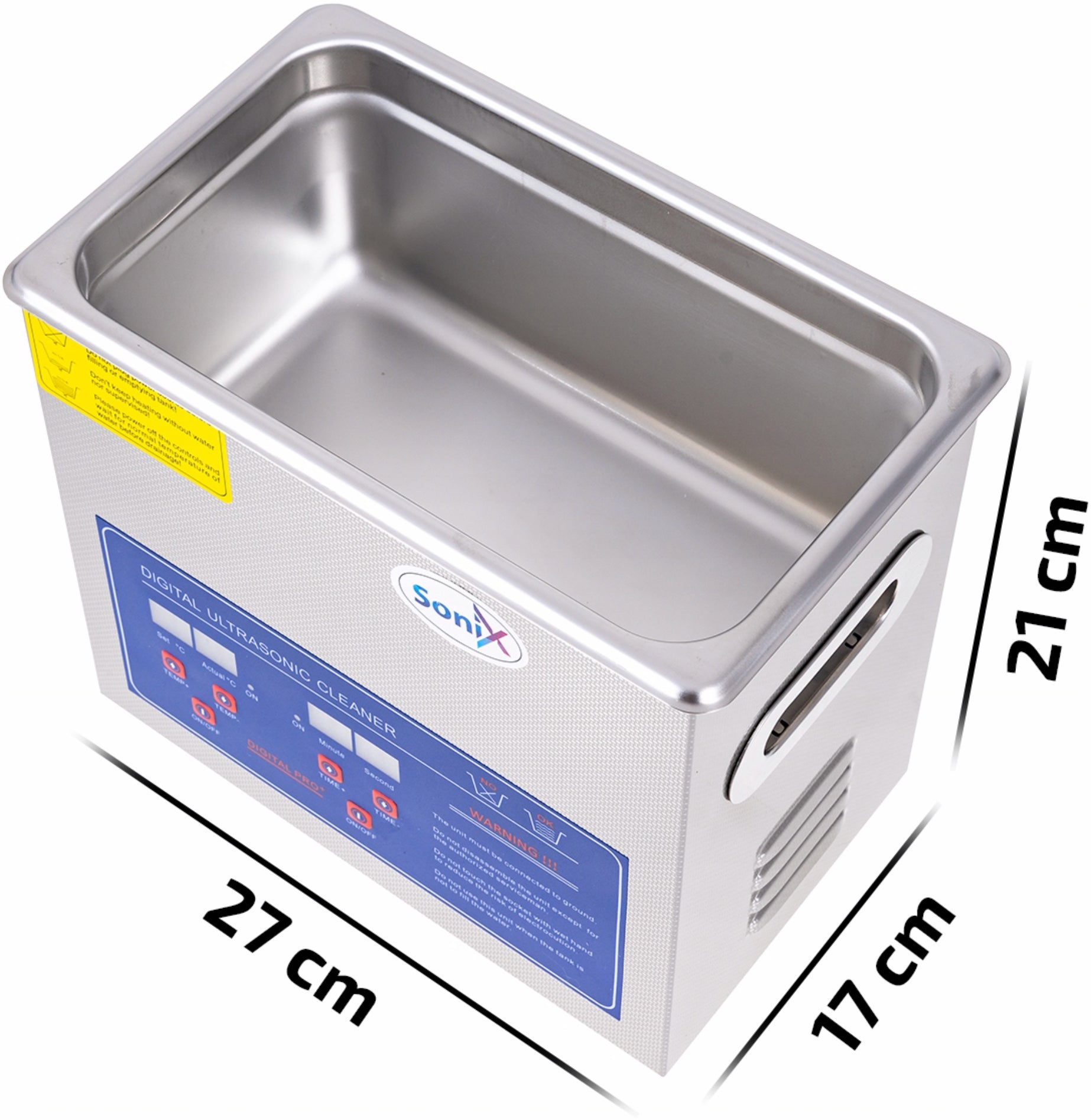 Especificación técnica: • Material del tanque: acero inoxidable • Capacidad: 3,2 L • Pantalla: LED • Tiempo de funcionamiento: 1-30 minutos, ajustable mediante botones • Fuente de alimentación: 220 - 240 V, 50/60 Hz • Frecuencia ultrasónica: 40 kHz • Potencia de calefacción: 100W • Potencia ultrasónica: 120W • Tamaño: 27 cm x 17 cm x 21 cm • Tamaño del contenedor: 13 cm x 24 cm x 10 cm (largo x ancho x alto) El conjunto contiene: • Limpiador ultrasónico SONIX 3.2L • Líquido limpiador SONIX 1 OOOx 1 L • Cable de alimentación • Cesta |