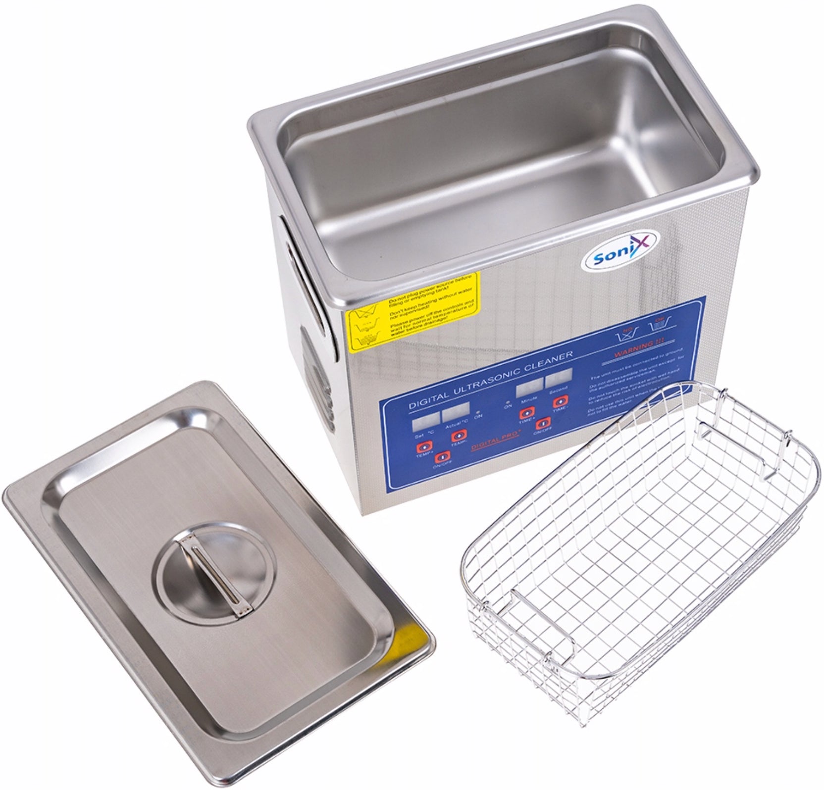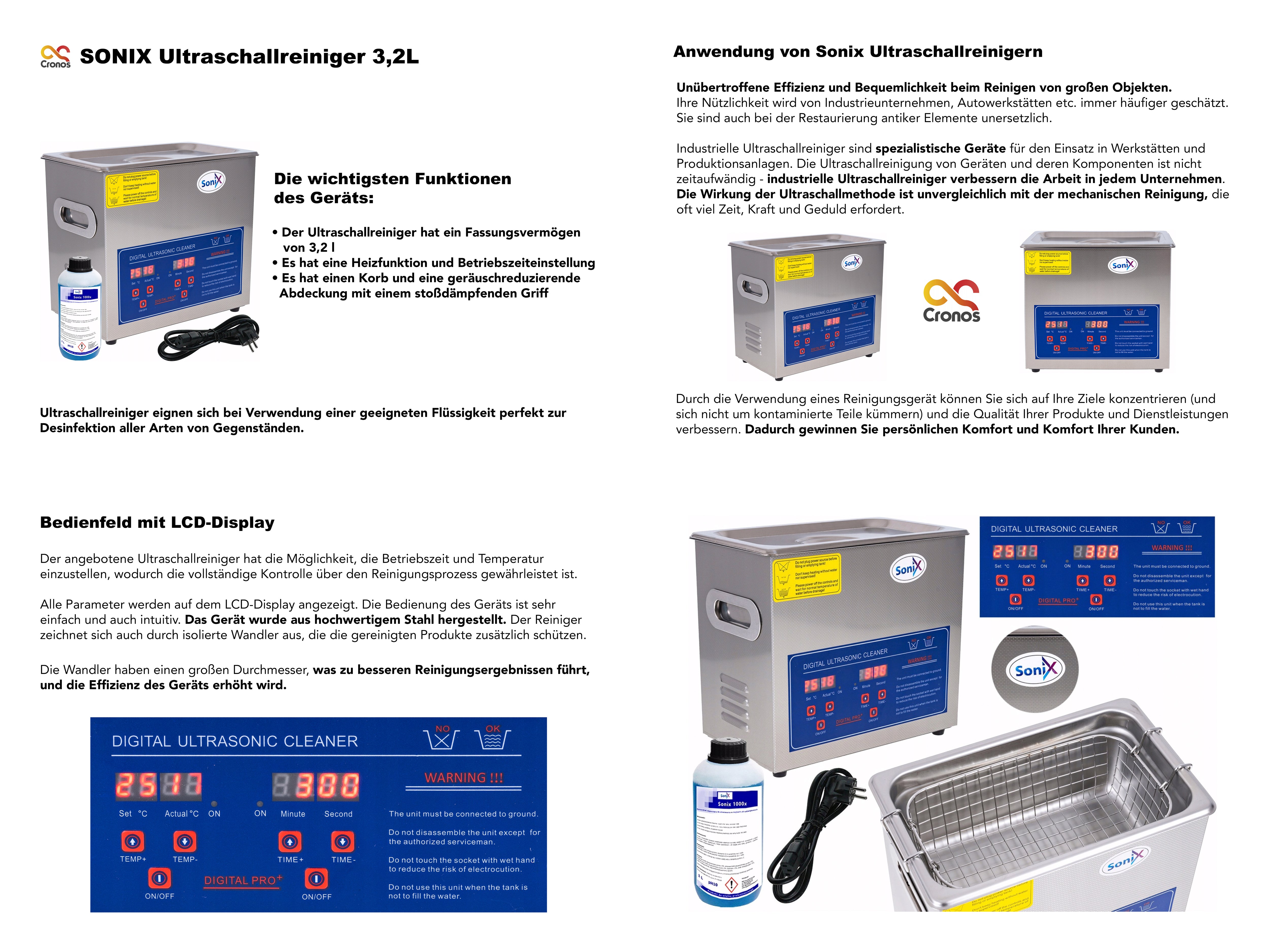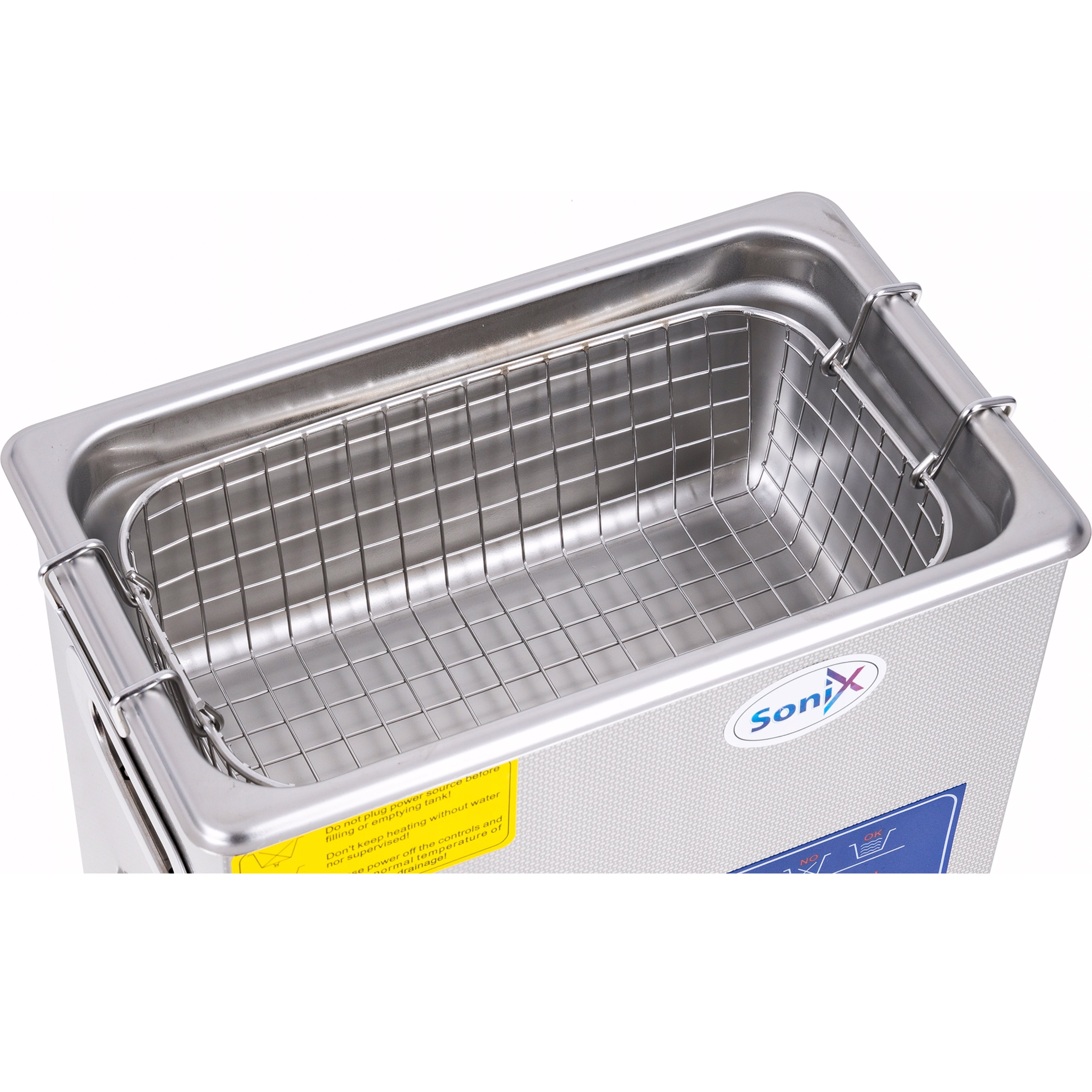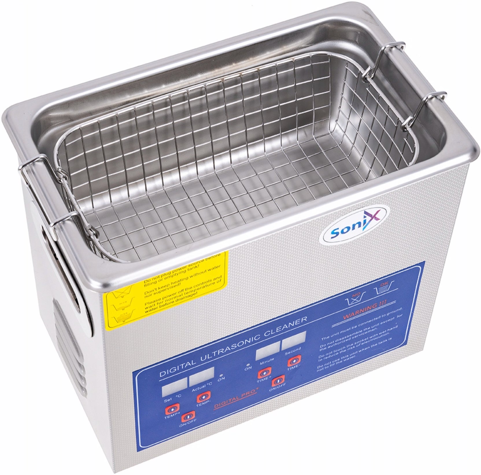 Especificación técnica: • Material del tanque: acero inoxidable • Capacidad: 3,2 L • Pantalla: LED • Tiempo de funcionamiento: 1-30 minutos, ajustable mediante botones • Fuente de alimentación: 220 - 240 V, 50/60 Hz • Frecuencia ultrasónica: 40 kHz • Potencia de calefacción: 100W • Potencia ultrasónica: 120W • Tamaño: 27 cm x 17 cm x 21 cm • Tamaño del contenedor: 13 cm x 24 cm x 10 cm (largo x ancho x alto) El conjunto contiene: • Limpiador ultrasónico SONIX 3.2L • Líquido limpiador SONIX 1 OOOx 1 L • Cable de alimentación • Cesta |