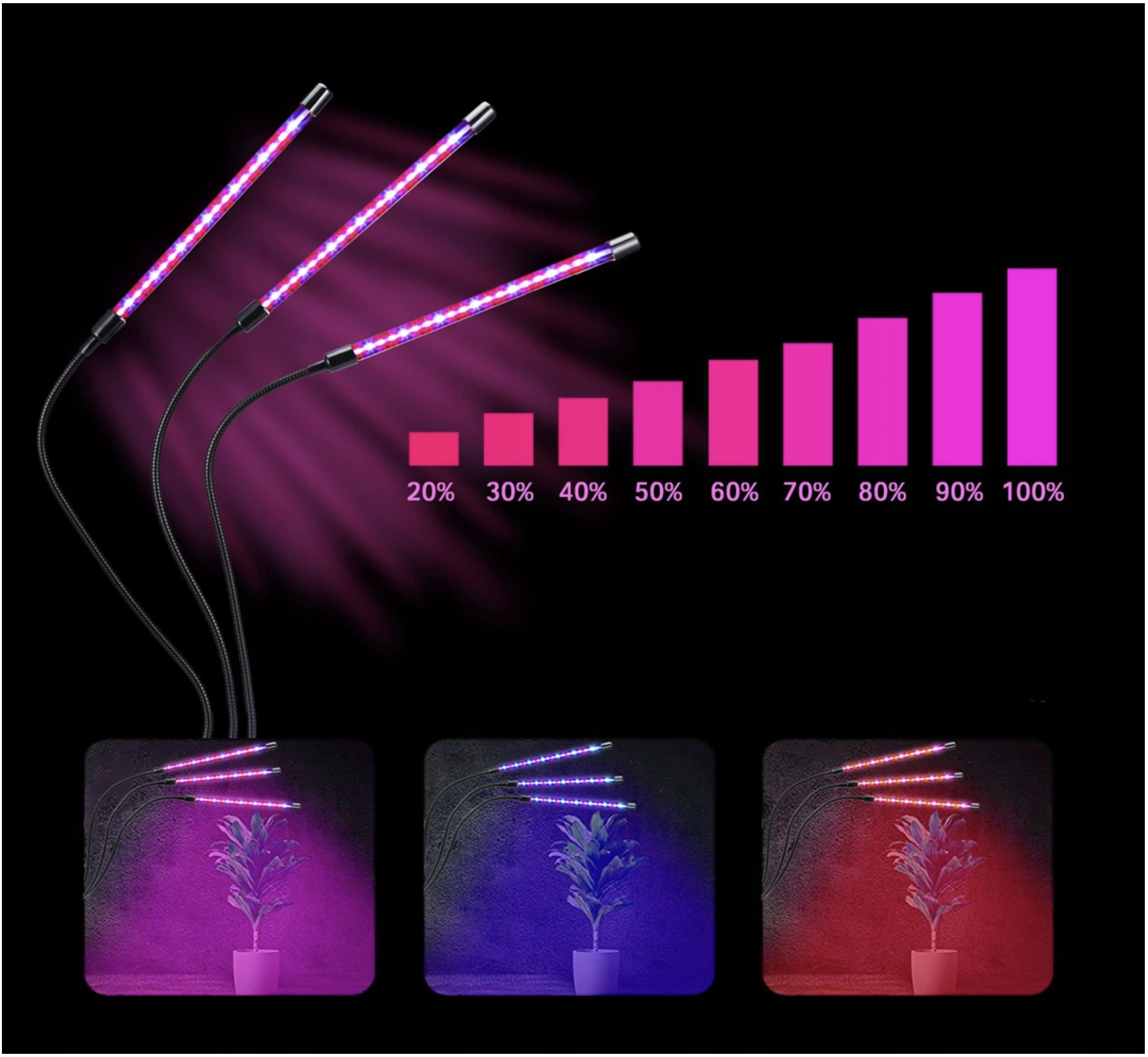 3 tipos de LED y 3 modos de iluminación en la lámpara para plantas. La lámpara para plantas de tres cabezas cuenta con LED COB de alta calidad en dos colores para favorecer el crecimiento y la floración. |