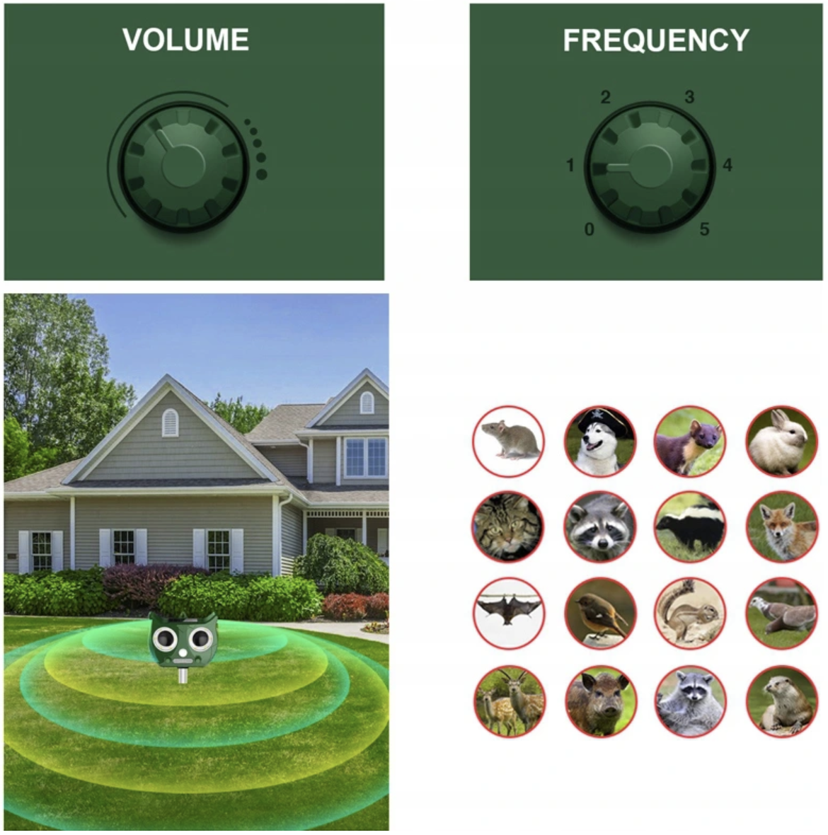 Acquista oggi un repellente per animali solare con un massimo di 4 modalità operative che colpiscono diverse specie animali: 1 modalità (13,5-19,5 kHz): topi, conigli, furetti, cani, martore 2 modalità (19,5-24,5 kHz): gatti, volpi, procioni 3 modalità (24,5-45,5 kHz): pipistrelli, uccelli, scoiattoli 4 modalità (segnali luminosi): cinghiali, cervi e altri animali del bosco |