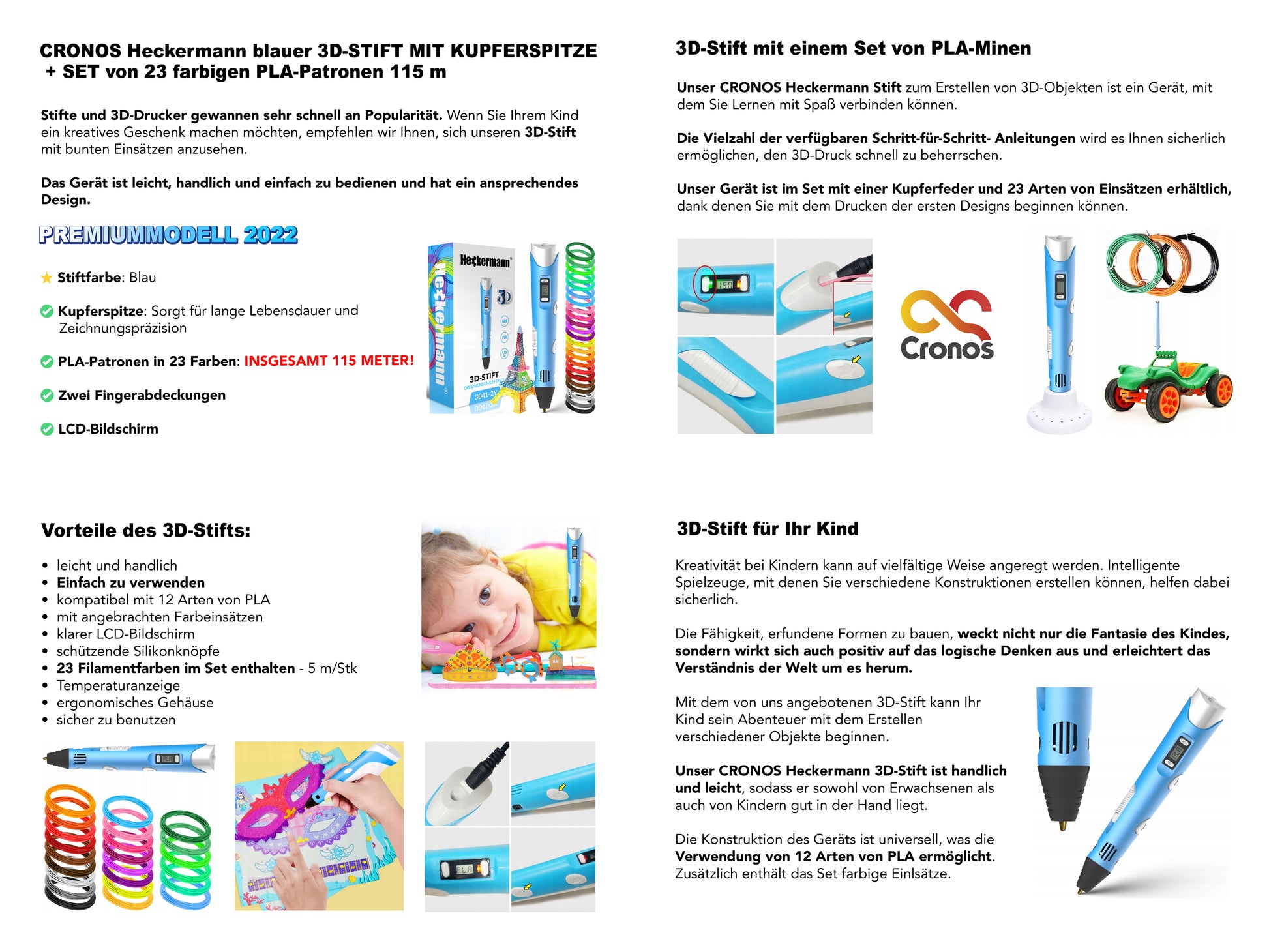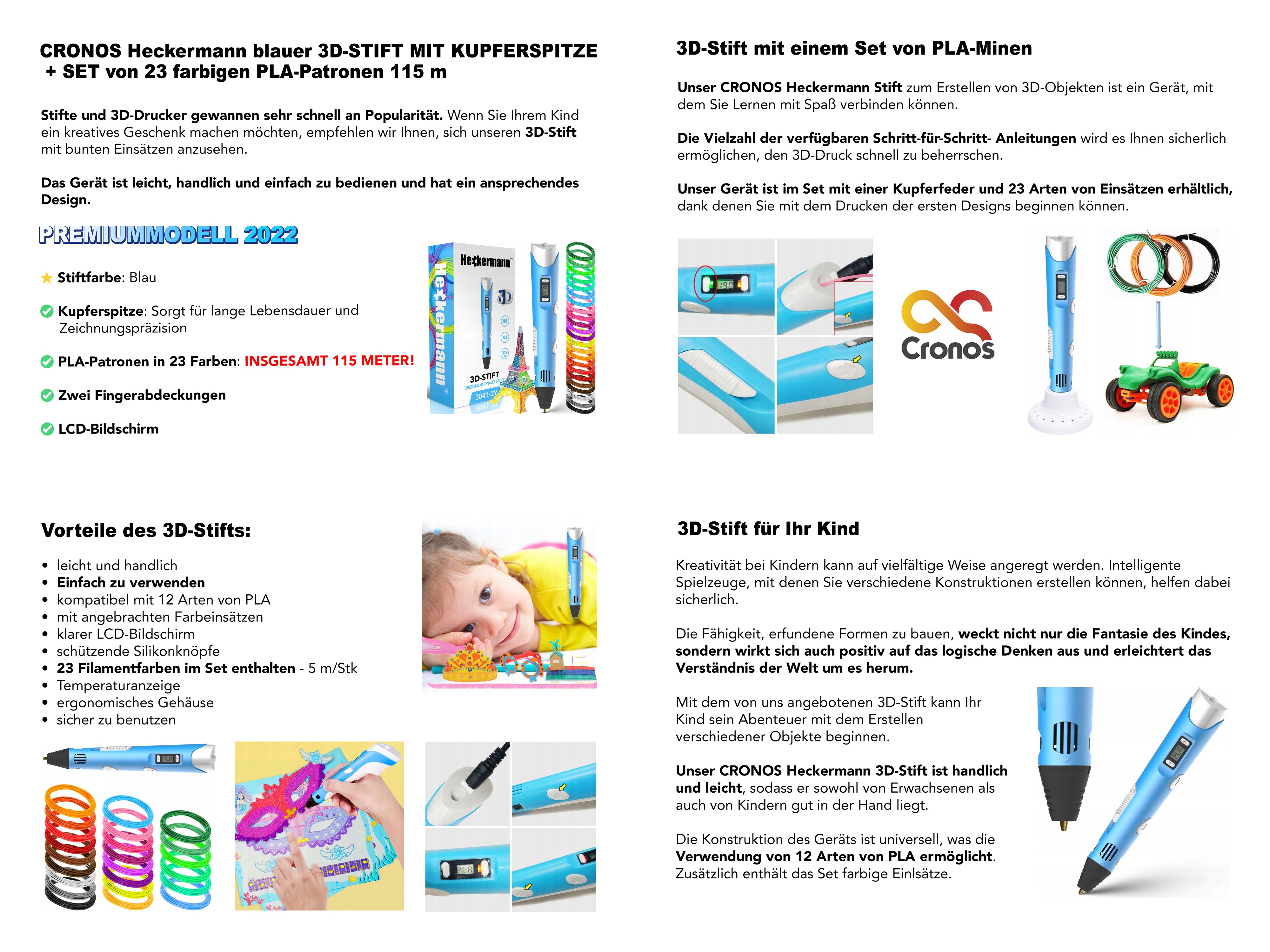 CRONOS Heckermann blauer 3D-STIFT MIT KUPFERSPITZE + SET von 23 farbigen PLA-Patronen 115 m |