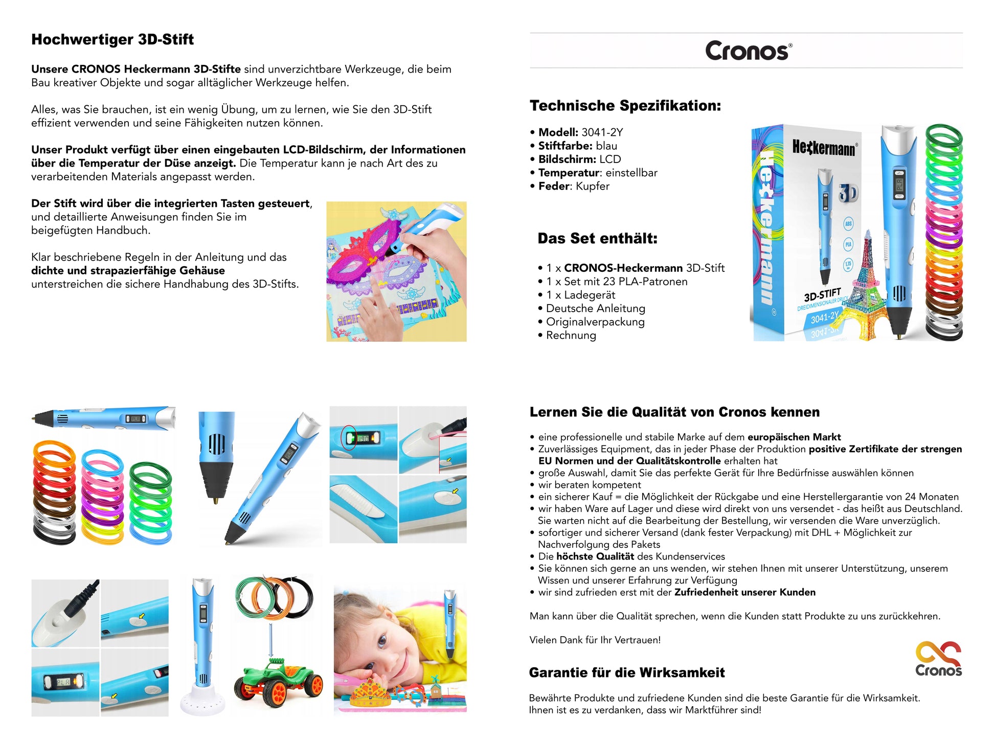 | Das Set enthält: • 1 x CRONOS-Heckermann 3D-Stift • 1 x Set mit 23 PLA-Patronen • 1 x Ladegerät • Deutsche Anleitung • Originalverpackung • Rechnung |