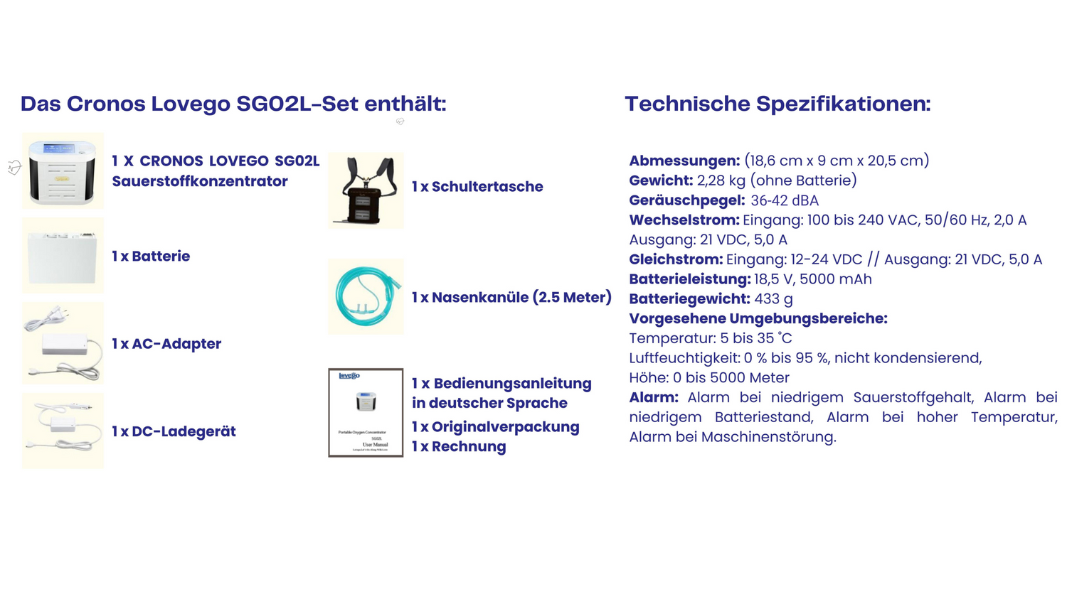 Tragbarer Sauerstoffkonzentrator CRONOS LOVEGO mit hoher Kapazität – frei atmen Wenn wir einen kontinuierlichen Sauerstofffluss von 5 Litern verwenden, nehmen wir während 1 Sekunde Einatmung 83 ml mit einem Atemzug auf: 5 Liter/60 Sekunden = 5000 Milliliter / 60 Sekunden = 83 ml/s. In einer Minute atmen wir 20 Mal Sauerstoff ein. Cronos Lovego SG02L ist der erste auf dem Markt, der die Aufnahme von 83 ml reinem Sauerstoff (>90%) in nur einem Atemzug ermöglicht. Vergleichbar wie konventionelle 5L Geräte. Lieferumfang: * CRONOS LOVEGO SG02L- Sauerstoffkonzentrator * Batterie * AC-Adapter * DC-Ladegerät * Schultertasche * Nasenkanüle (2,5 Meter) * Umfangreiche Bedienungsanleitung in deutscher Sprache * Originalverpackung * Rechnung |